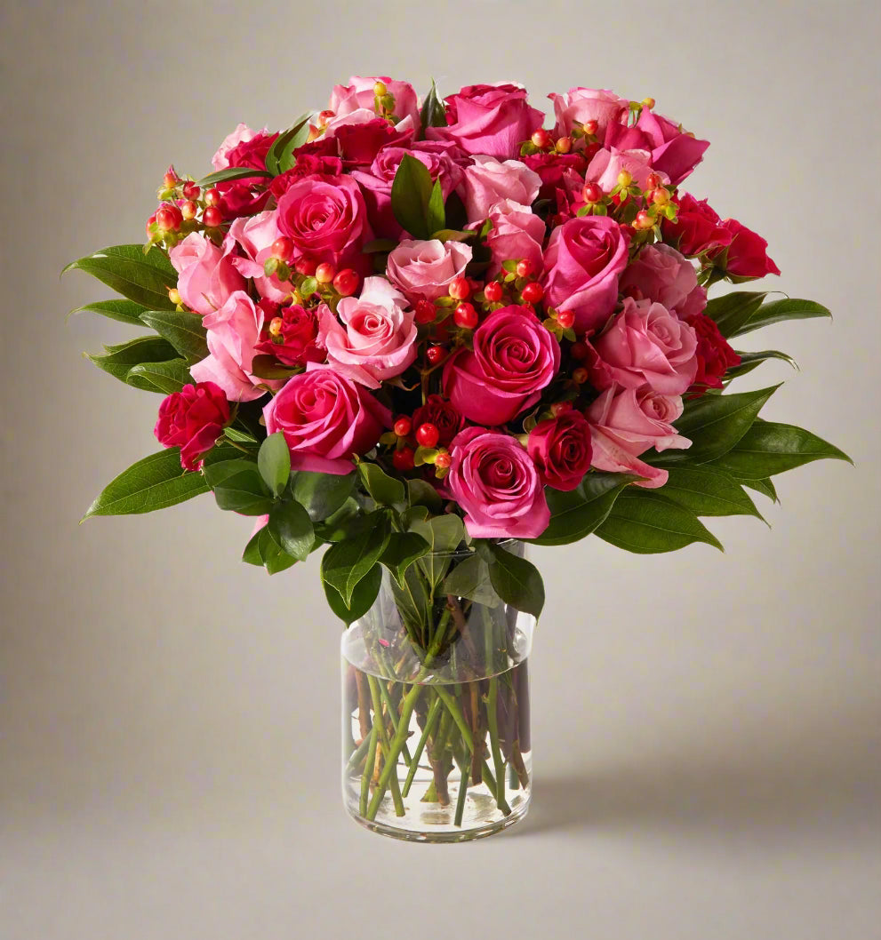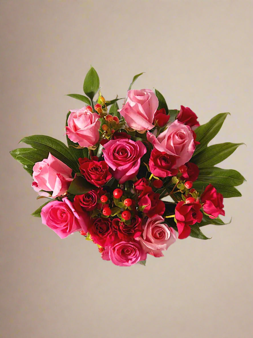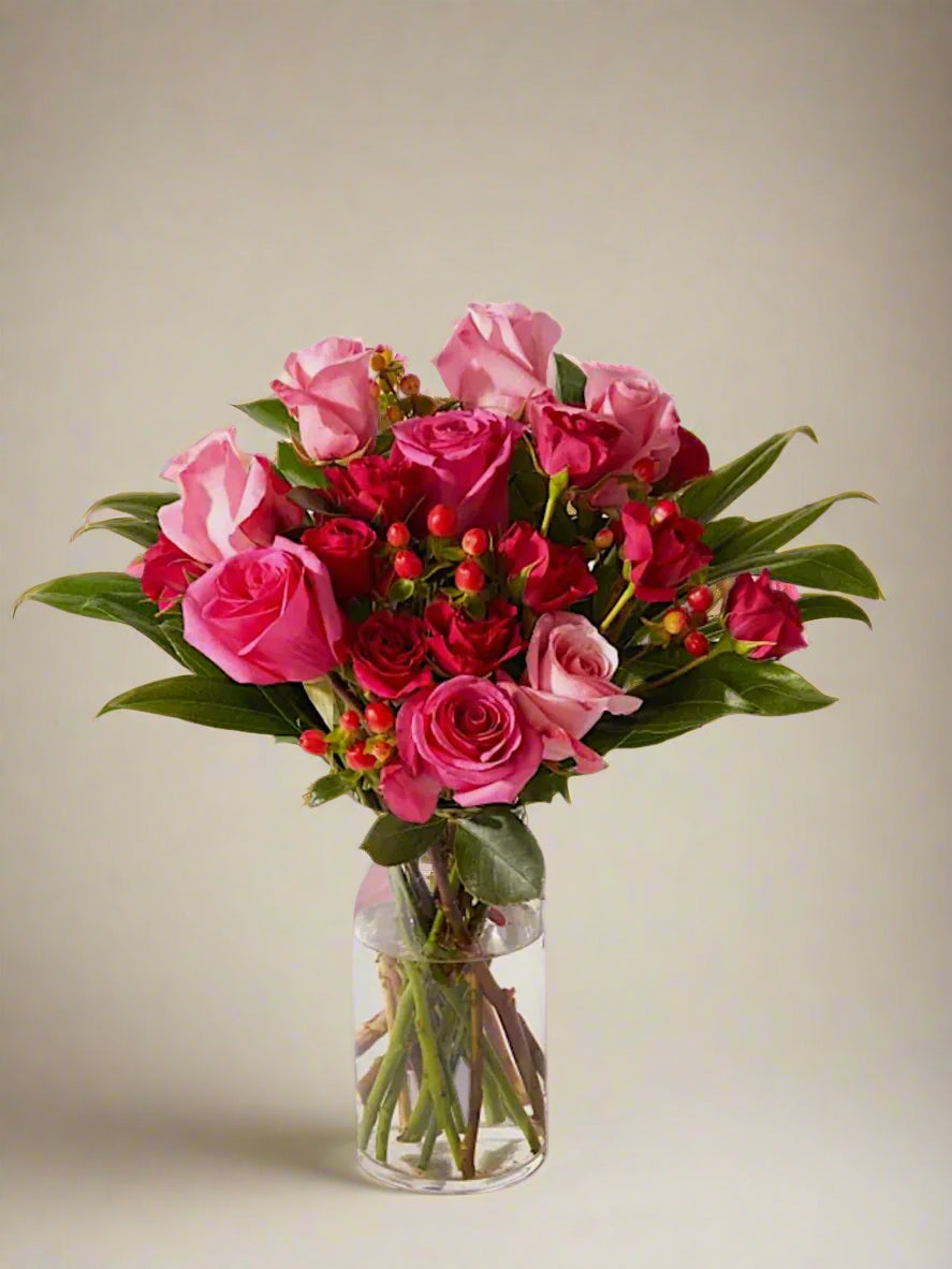 Dark red berries and cherry colored roses mixed together un this bouquet.