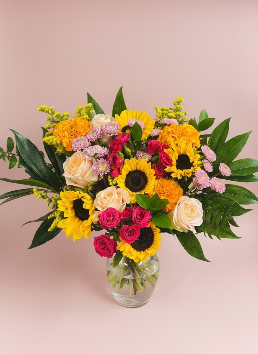 This lush and large sunflower bouquet mixed with bright and blush roses.