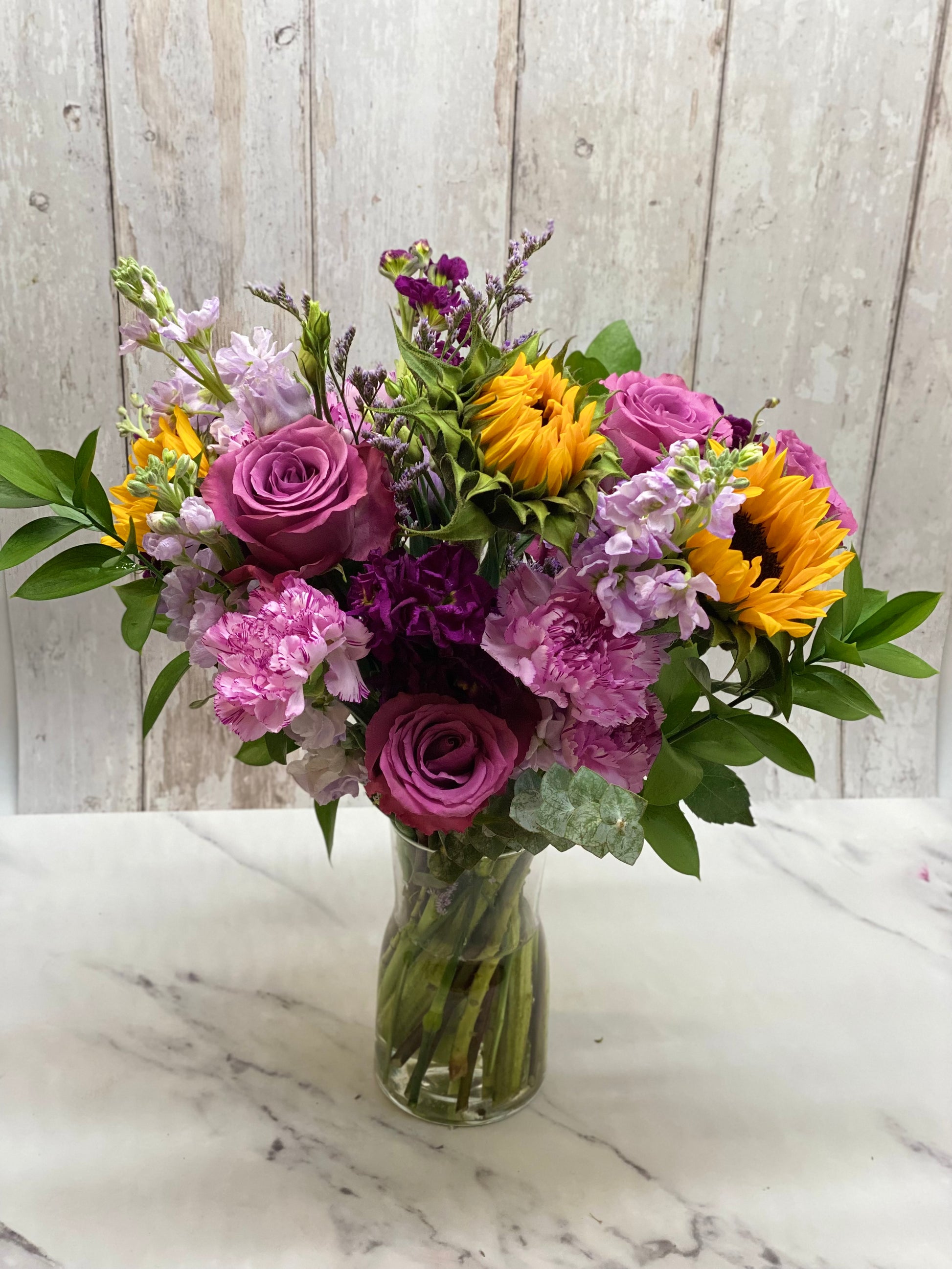 Sunflowers mixed with bunch of purples contrast each other and blends to perfect bouquet.