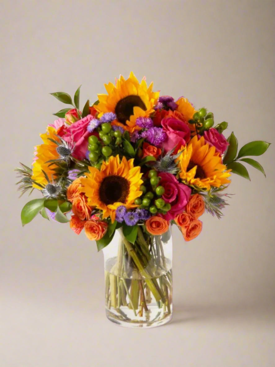 Cheerful and fun mix of sunflowers and baby roses. Perfect arrangement for coffee table. Beautiful all around arrangement with bright colors many different textures of flower materials.